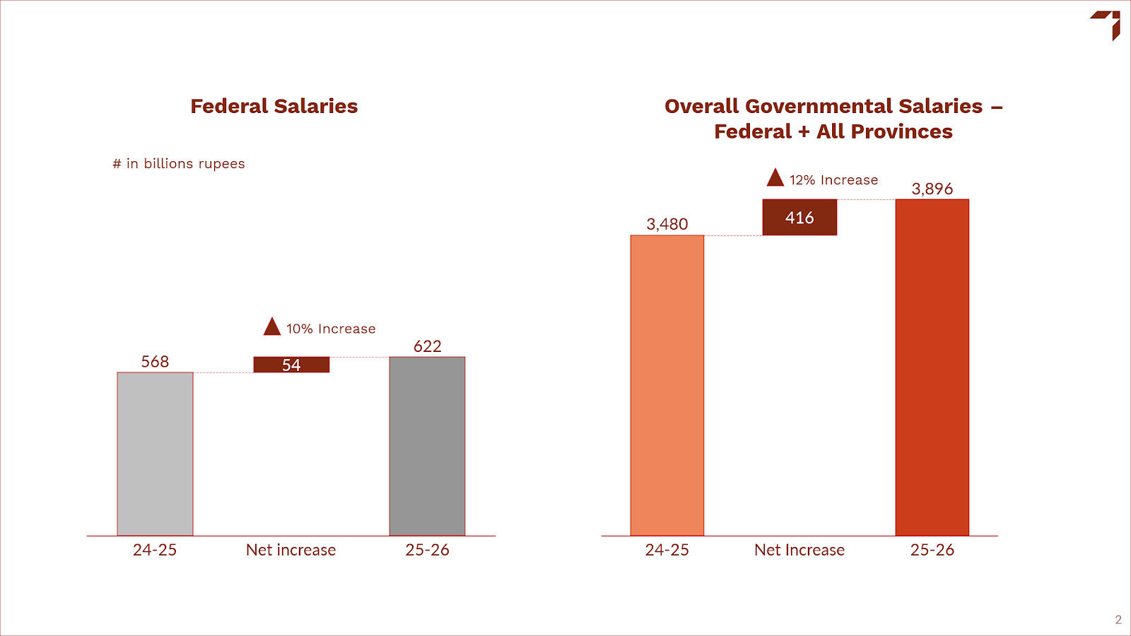 Taking the federal government’s salary bill alone, excluding the military, basic pay was budgeted at Rs 538 billion in 2024-25. Similarly, the salary bills of all four provincial governments add up to approximately Rs 3.48 trillion for 2024-25. Following the announced pay increases and higher provincial allocations, the federal bill increased to Rs. 622 billion and the consolidated national salary bill for 2025-26 now stands at roughly Rs 3.9 trillion. This represents an increase of about Rs 416 billion in just one year, or around 12 percent (figure 1). This figure does not include hundreds of thousands of employees working in universities, autonomous bodies, and state-owned enterprises, which follow similar pay structures.